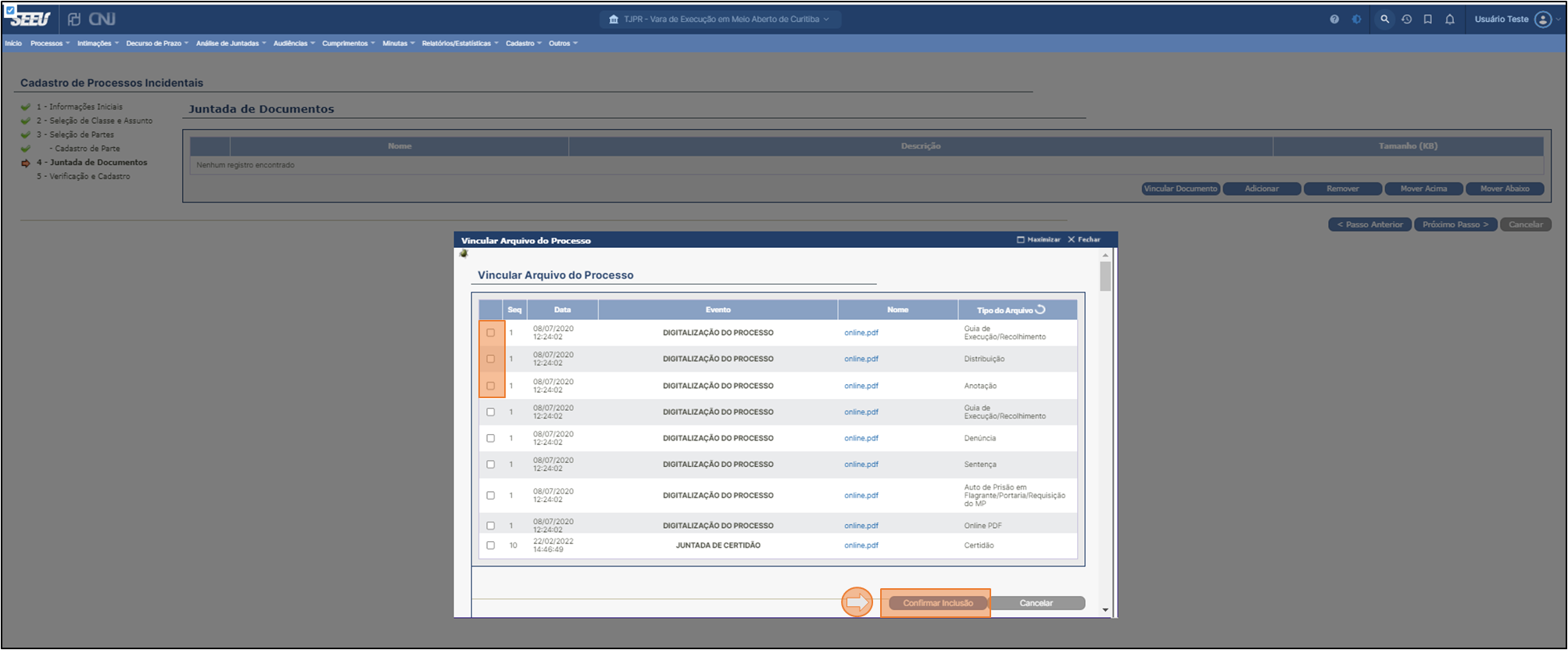 • Para Vincular um ou mais documentos, clique na caixa de marcação (checkbox) correspondente ao(s) documento(s) e clique no botão Confirmar Inclusão.