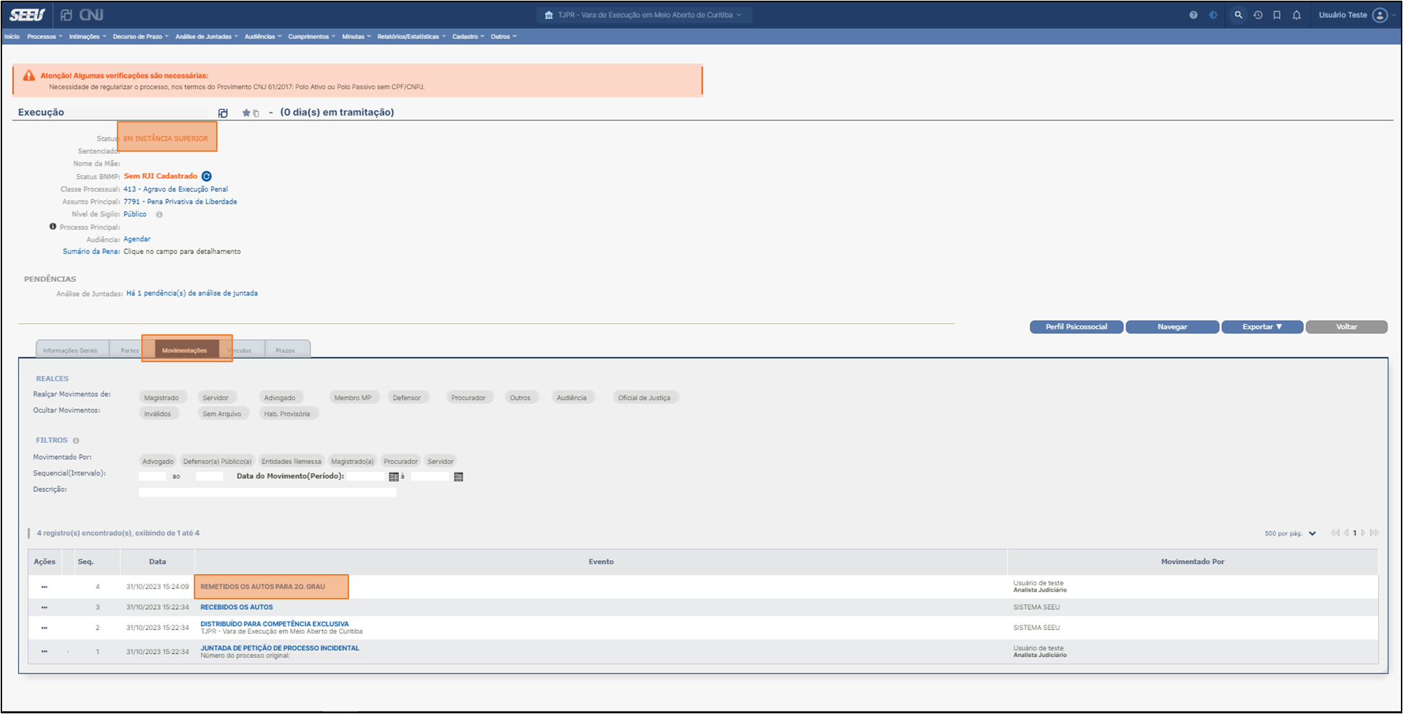 • Uma vez exportado para o 2º Grau, observe a situação Em Instância Superior na capa do processo, e o respectivo trâmite na aba de movimentações.