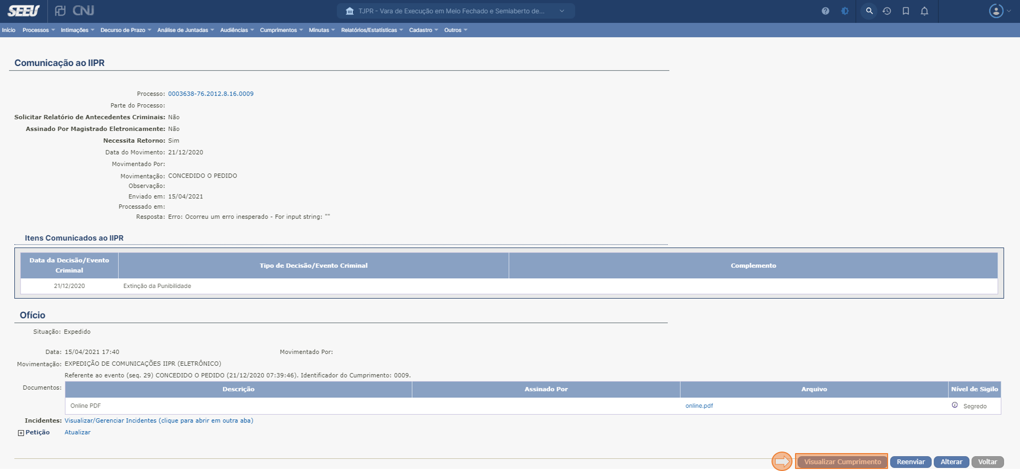 • Para retornar a tela de cancelamento de IIPR selecione Visualizar Cumprimento.
