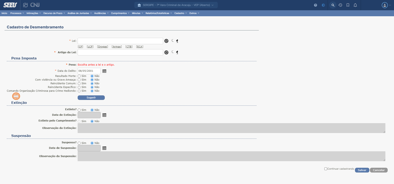 - O campo de "Regime de Pena" foi ocultado, assim como a coluna "Prazo Imposto" da tabela de Desmembramento.